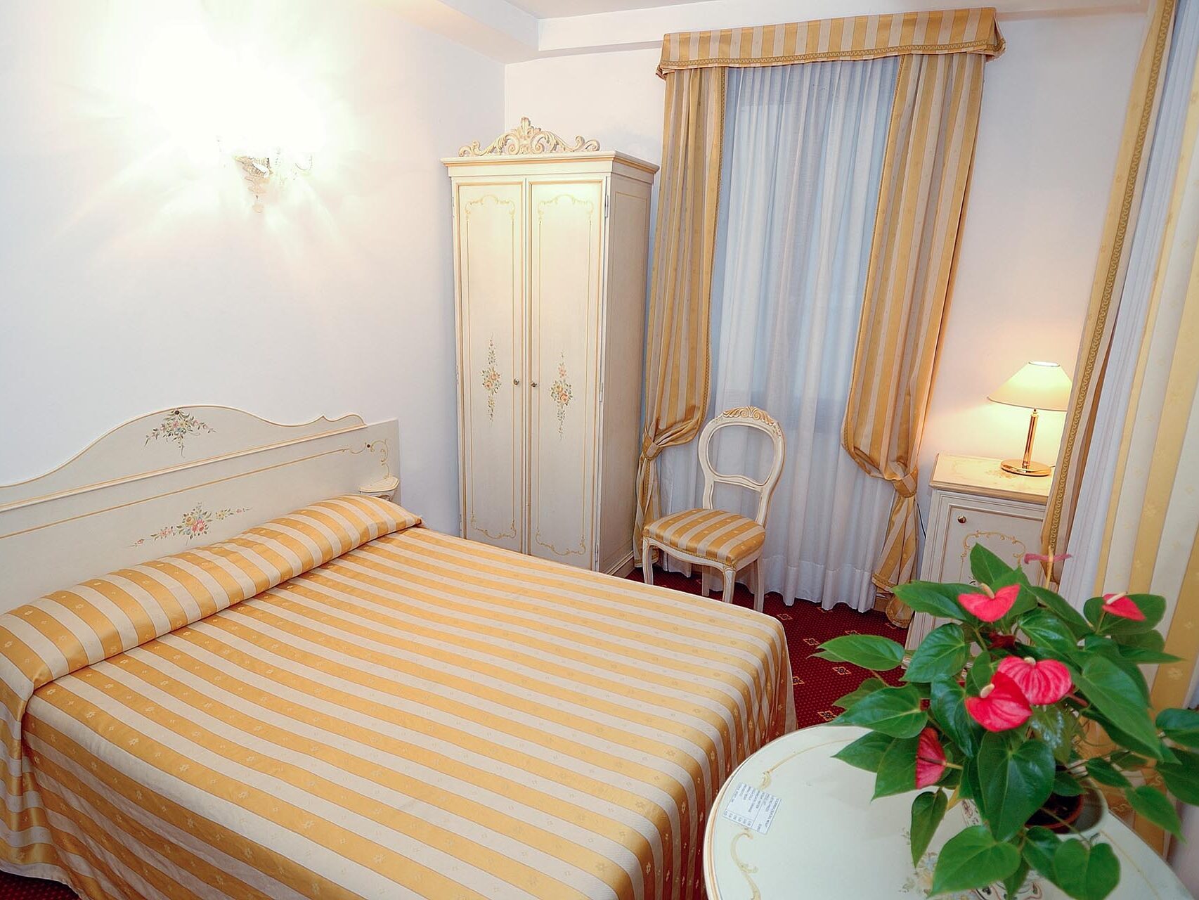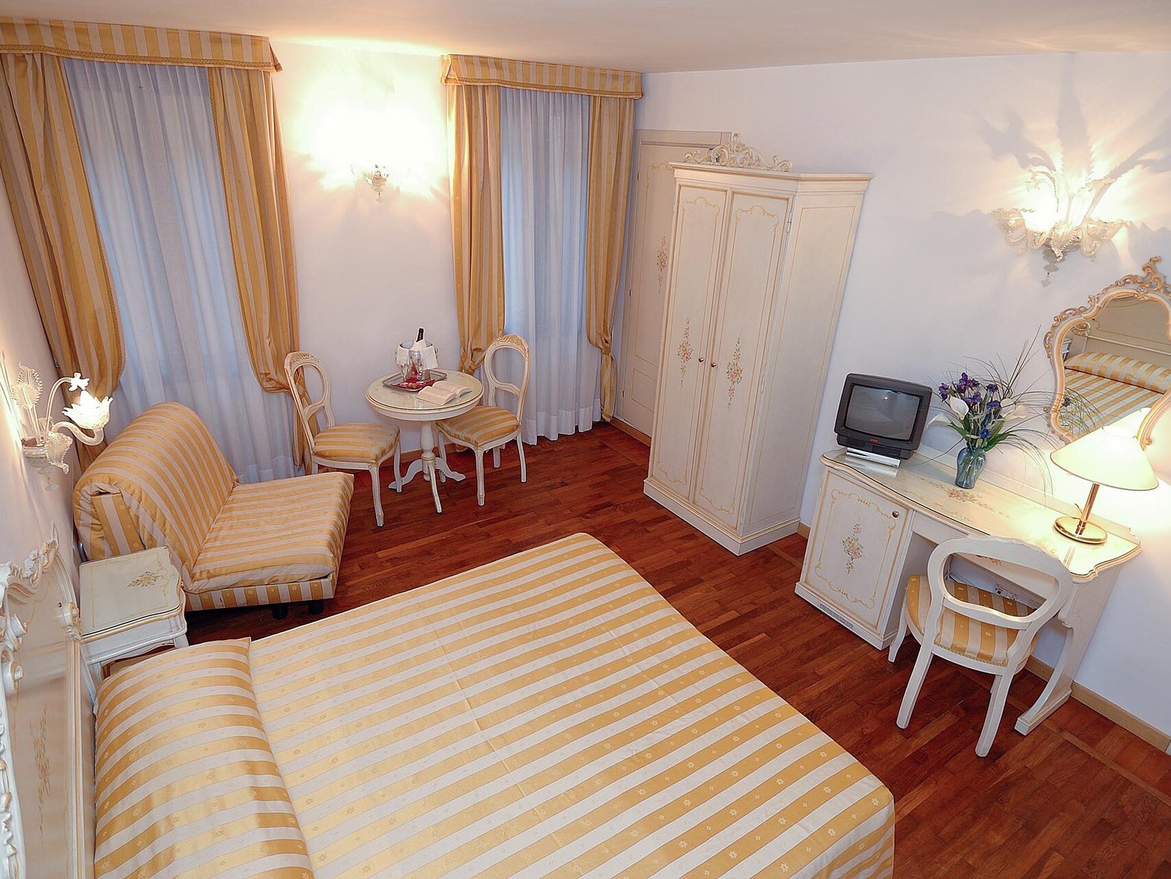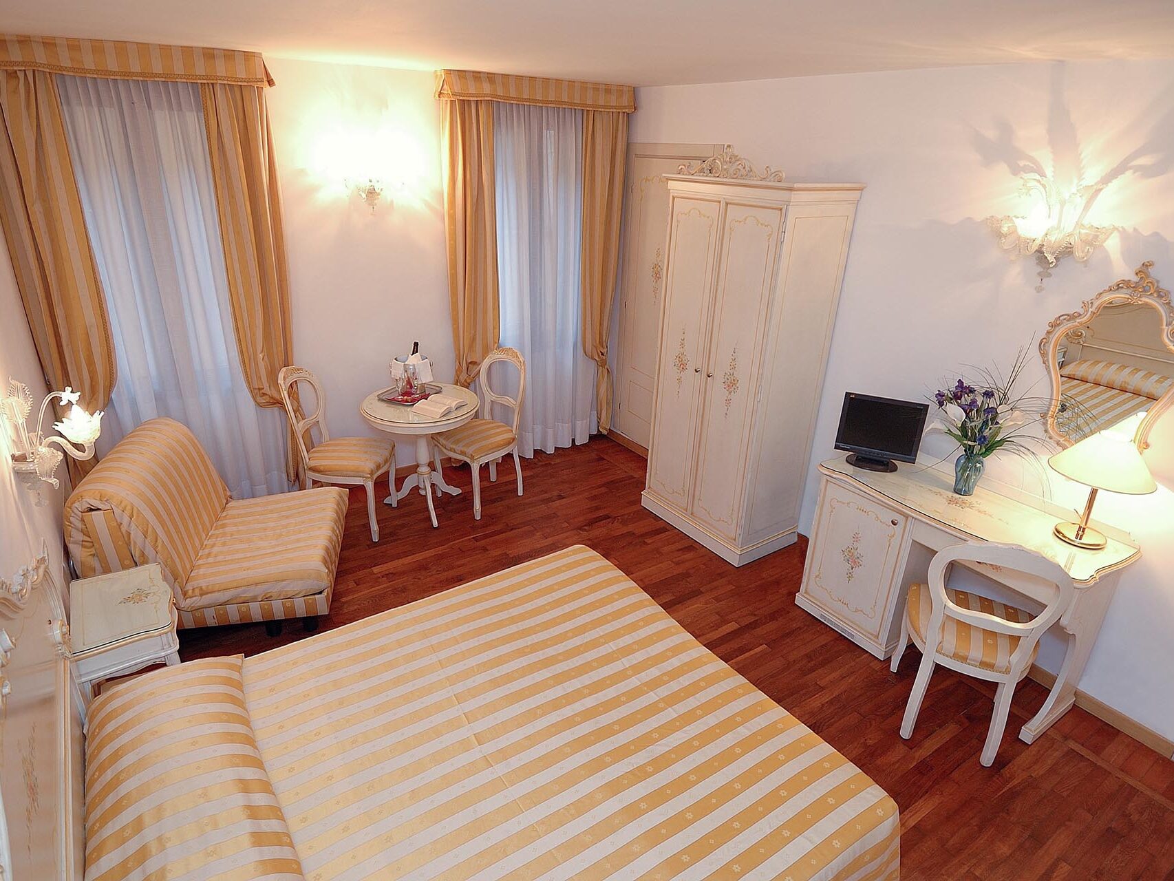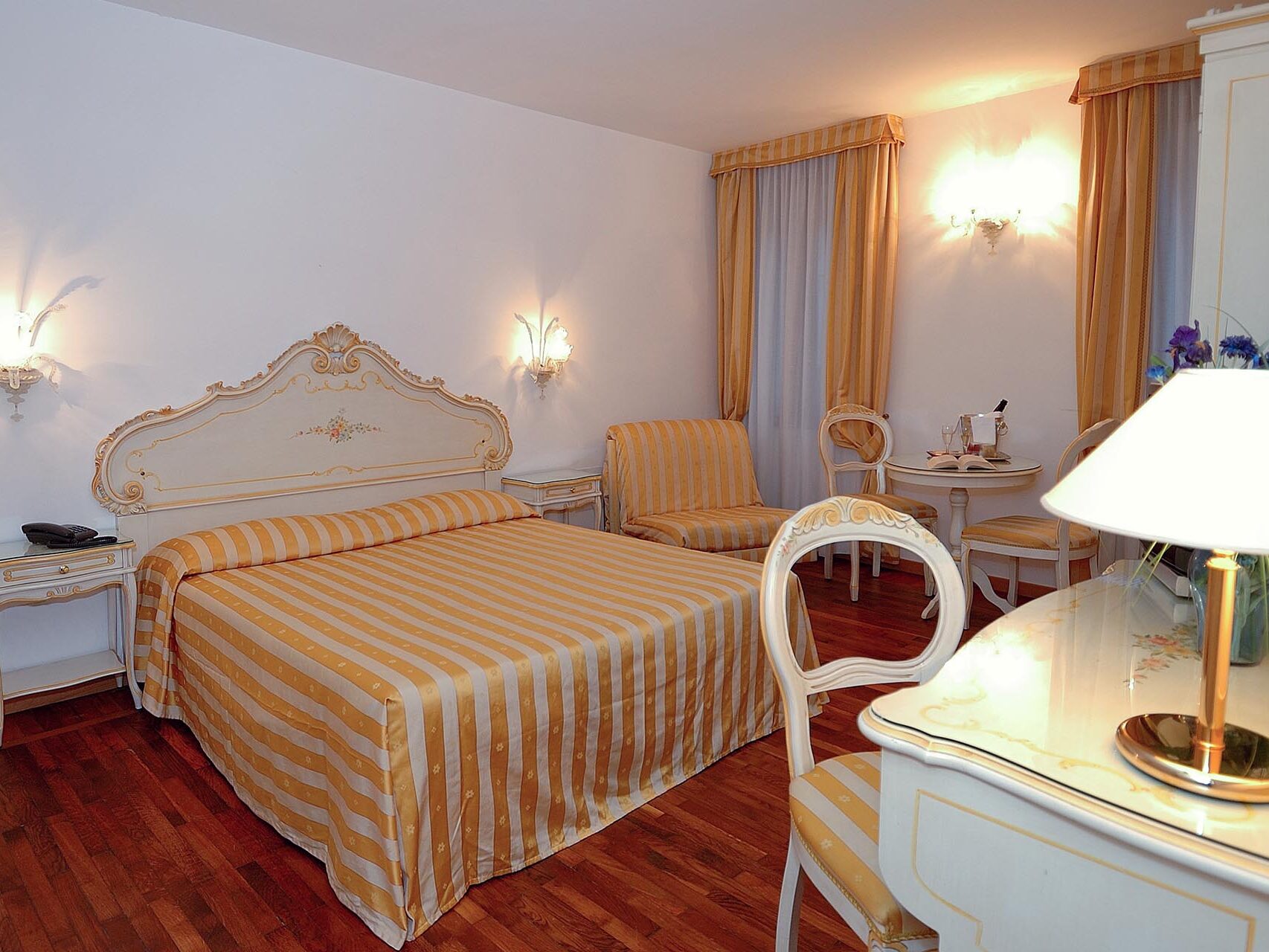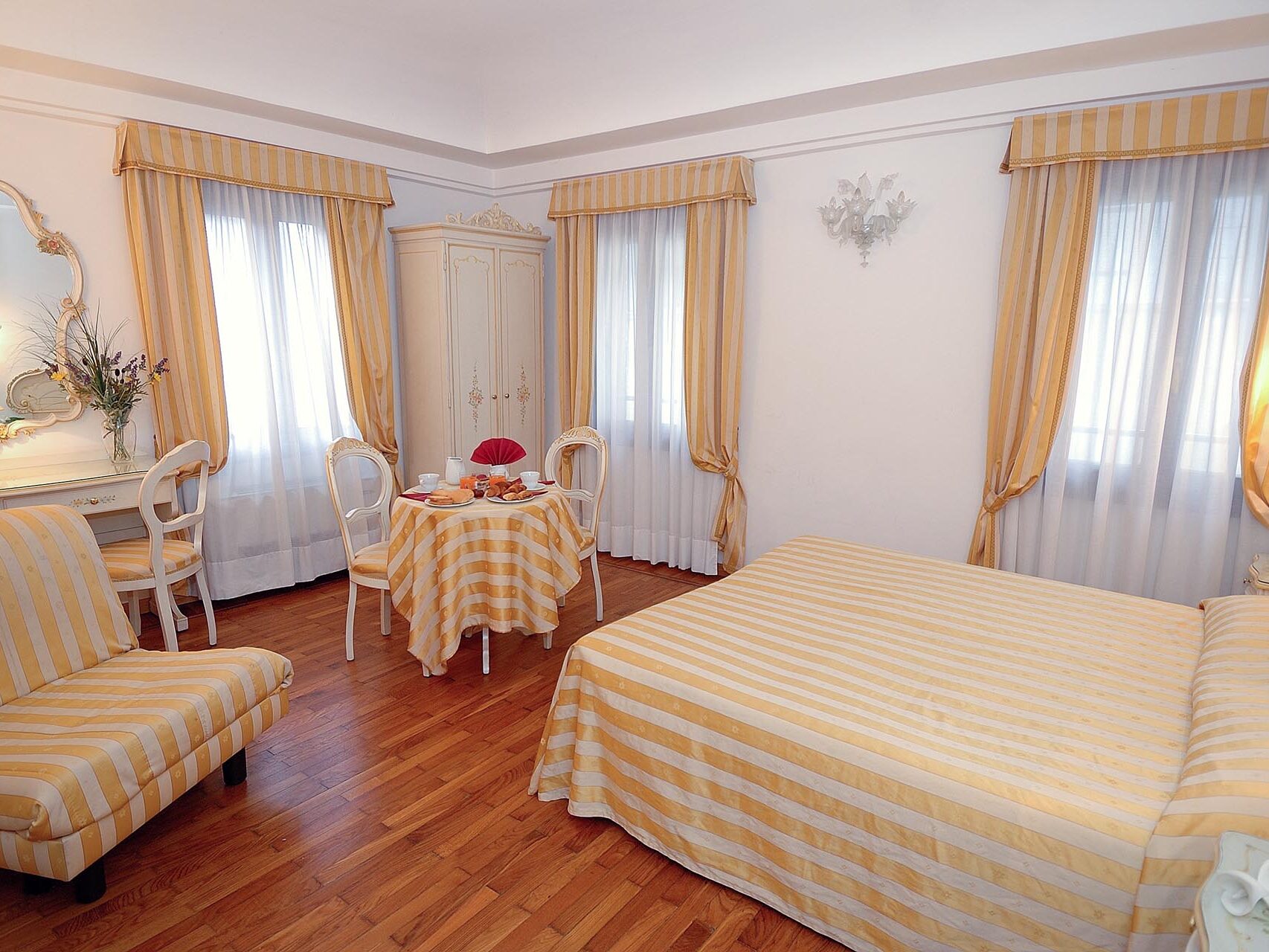 Le camere finemente arredate in stile veneziano rievocano lo sfarzo del tempo dei Dogi della Repubblica Serenissima. I tessuti pregiati, i tendaggi, i lampadari in vetro di Murano e i mobili in stile barocco veneziano donano raffinatezza ed esclusività alle camere. Tutti i bagni sono spaziosi e dotati di doccia, lavabo, bidet, asciugacapelli e set di cortesia. Le camere sono climatizzate e dispongono di frigobar, telefono, TV satellitare, cassaforte e connessione Wi-Fi.
